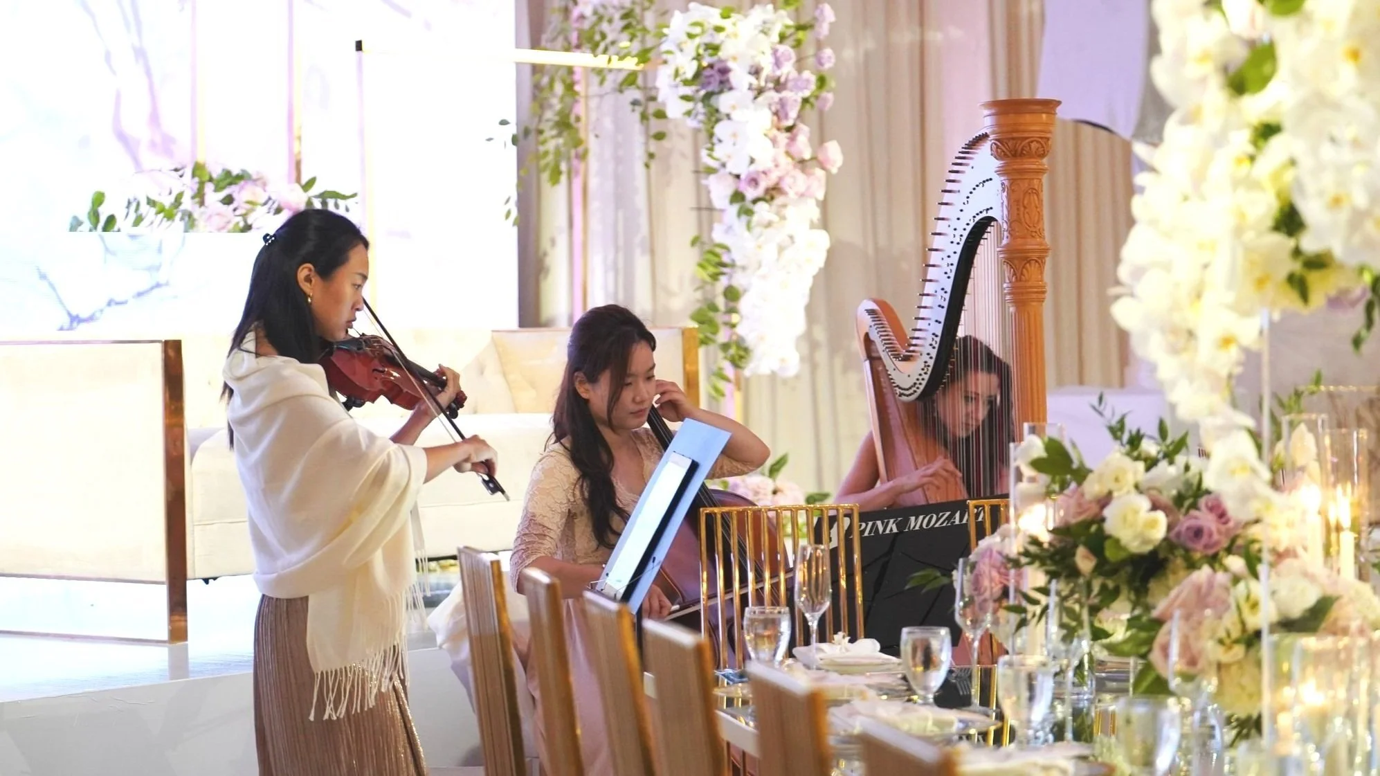 Experience musical elegance at its finest with Pink Mozart's signature Harp Quartet. The harmonious blend of harp, violin, cello, and bass creates an ethereal soundscape that captivates the romance.